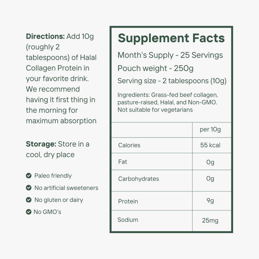 Glow from the inside out with Halal Vitality Halal Collagen Protein—made just for Muslims, by Muslims.